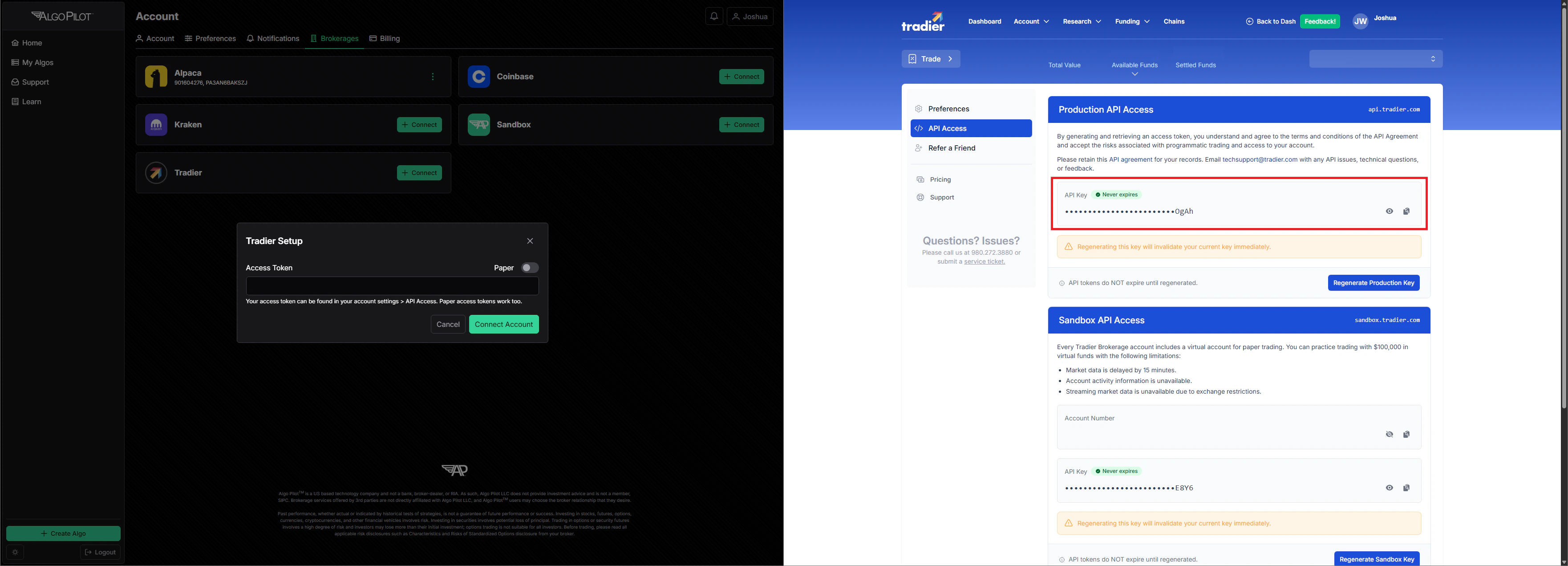 To connect your Tradier brokerage account, visit your Tradier dashboard and navigate to the API Access page. There, you will find your API key for production access. After entering your API key, we will automatically import all of your accounts with Tradier.